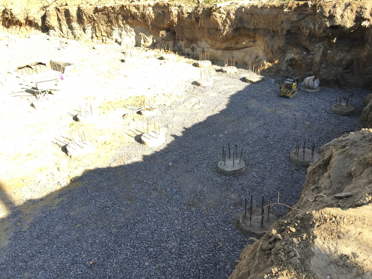 Трамбовка грунта и засыпка щебневого слоя, под устройство бетонной подготовки под гидроизоляцию и ростверк.