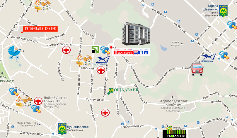 Удобная транспортная развязка позволяет за несколько минут попасть на основные транспортные артерии столицы. Располагаясь вблизи от центра Киева, новостройка остается в тихом и спокойном районе. В районе дома находятся школы и детские сады (в т.ч. элитные), банки, магазины и супермаркеты. Также вблизи - 2 станции метро: М Лукьяновская и М Тараса Шевченко.